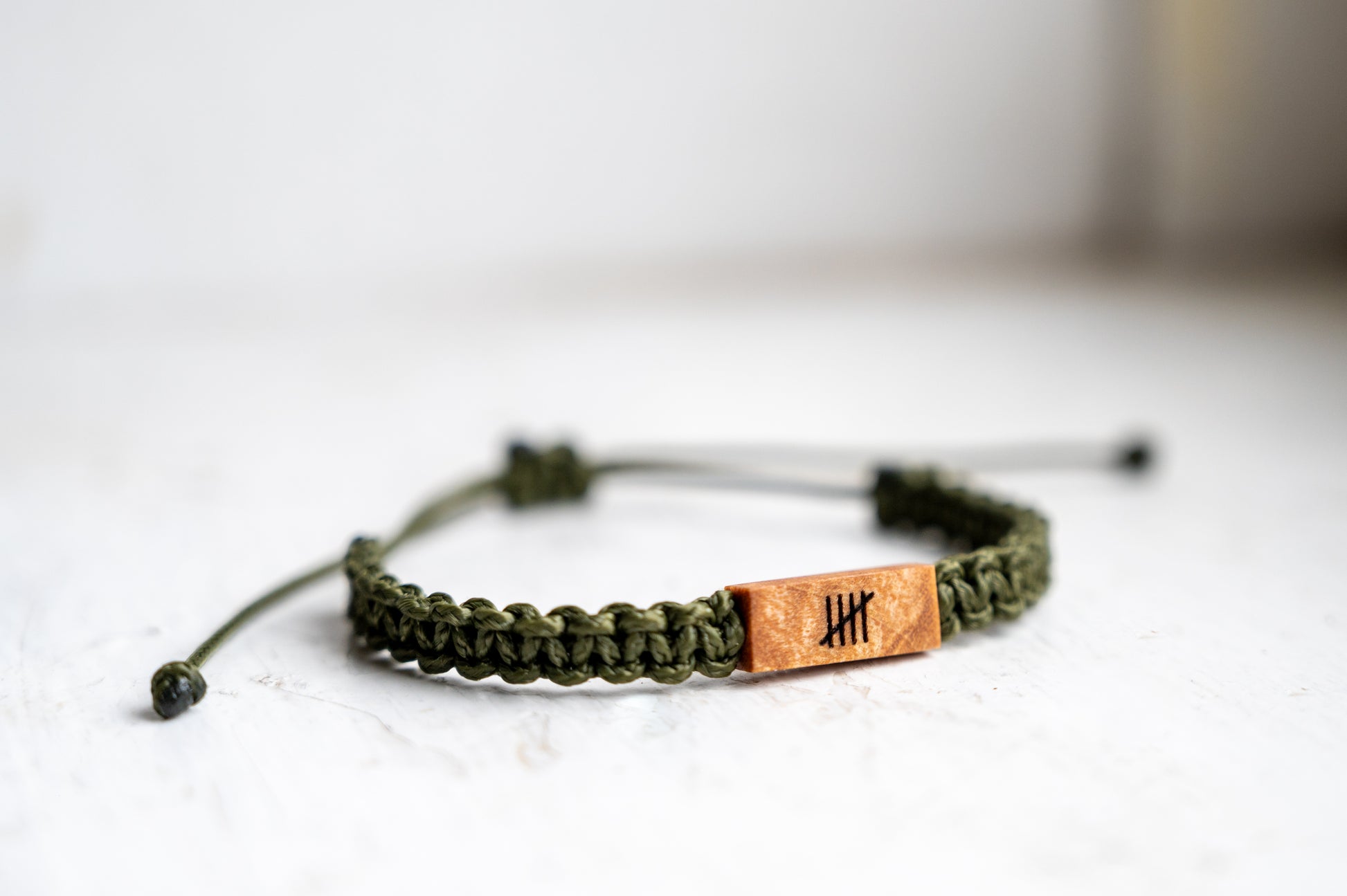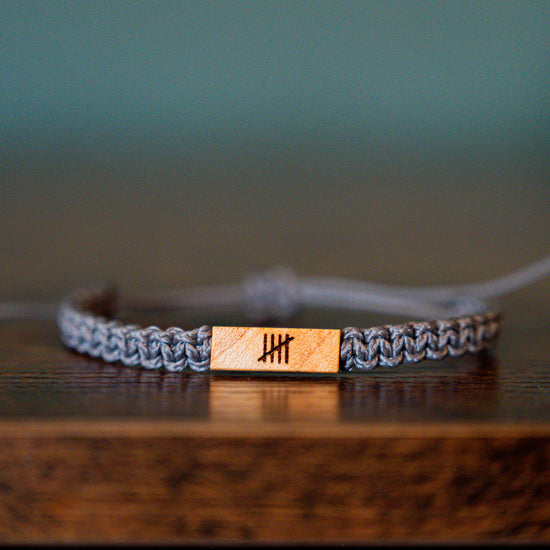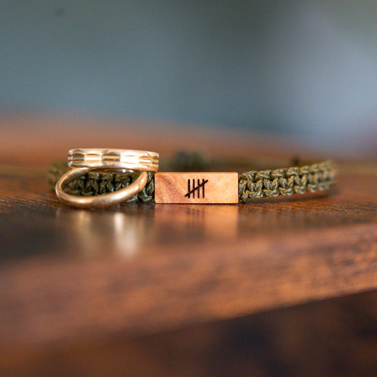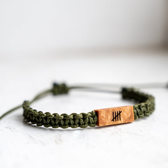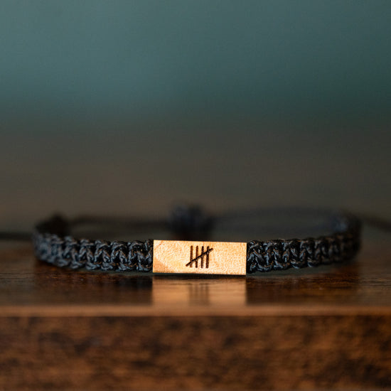 Mark your 5th anniversary with a symbol of enduring love and commitment. This handcrafted wood and macramé bracelet features five tally marks meticulously burned into reclaimed maple wood. This reversible piece allows you to showcase the tally marks on one side, while adding a personal touch to the other side. It's a beautiful reminder of the journey you've shared and the milestones you've reached together.