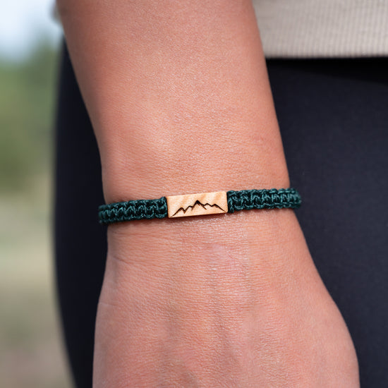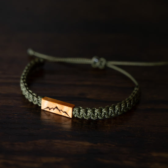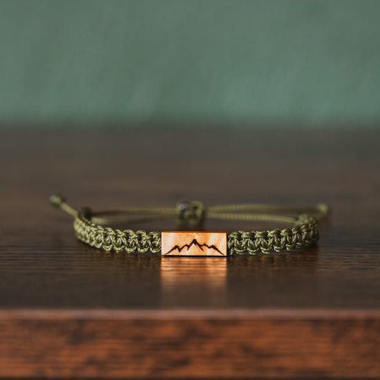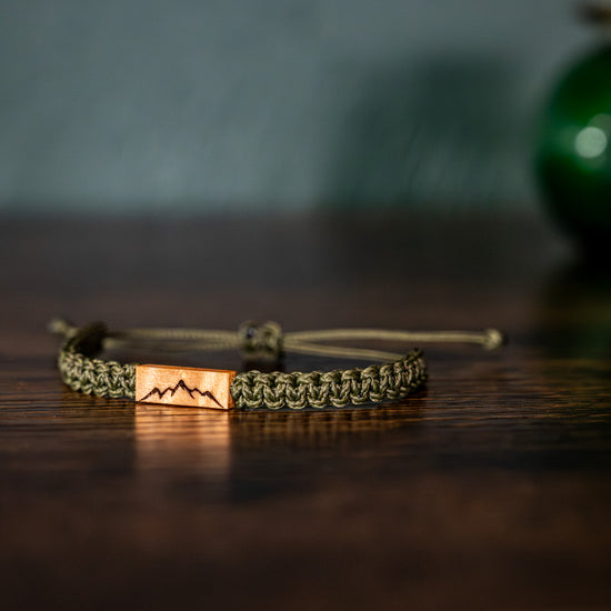 Embrace the spirit of adventure with this Mountain Range Maple & Macramé Bracelet. This design features a stylized mountain range silhouette, meticulously burned into a piece of reclaimed maple burl wood. This reversible piece allows you to showcase the mountain range on one side. It's the perfect accessory for nature lovers, outdoor enthusiasts, and anyone who finds inspiration in the majestic beauty of mountains.