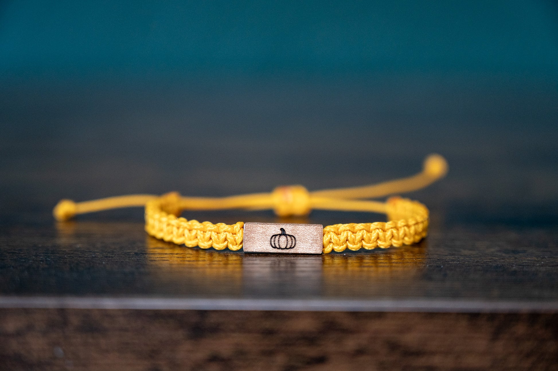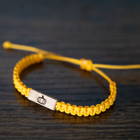 Embrace the cozy energy of autumn with this limited-edition Pumpkin Macramé Bracelet. This design features a classic pumpkin outline, meticulously engraved into a beautiful piece of reclaimed Maple Burl wood. It's the perfect gift for fall lovers, a festive Thanksgiving accessory, or a treat for an autumn birthday.