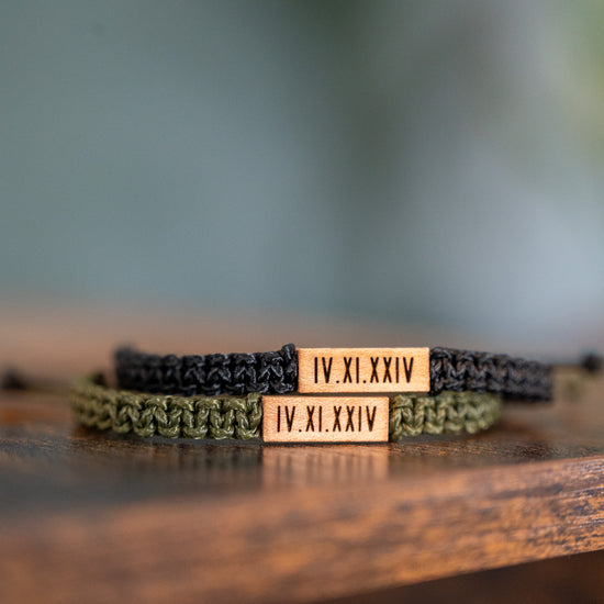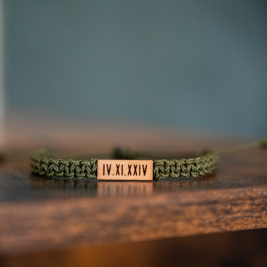 Keep a meaningful date or number close with this handcrafted Roman Numerals Bracelet. This custom design is meticulously engraved into a beautiful piece of reclaimed Maple Burl wood. It's the perfect, sophisticated way to honor a significant moment, making it a unique gift for an anniversary, wedding, or birthday.