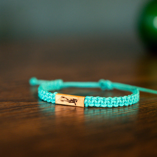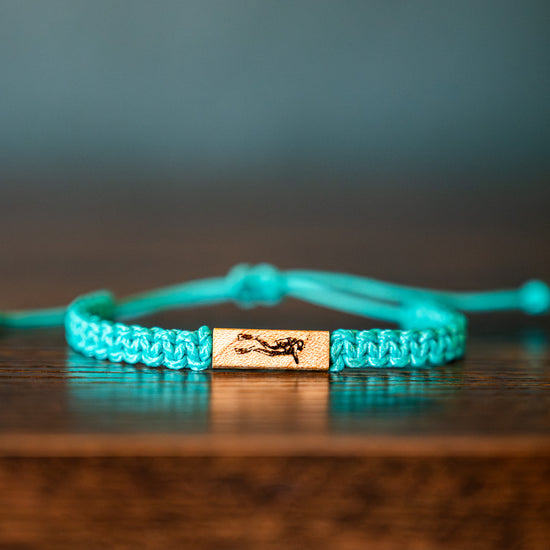 This bold bracelet is a tribute to the silent, fascinating world beneath the waves. A clean outline of a scuba diver is meticulously engraved on a beautiful piece of reclaimed Maple Burl wood. It's the perfect gift for certified divers, snorkelers, and any ocean enthusiast.